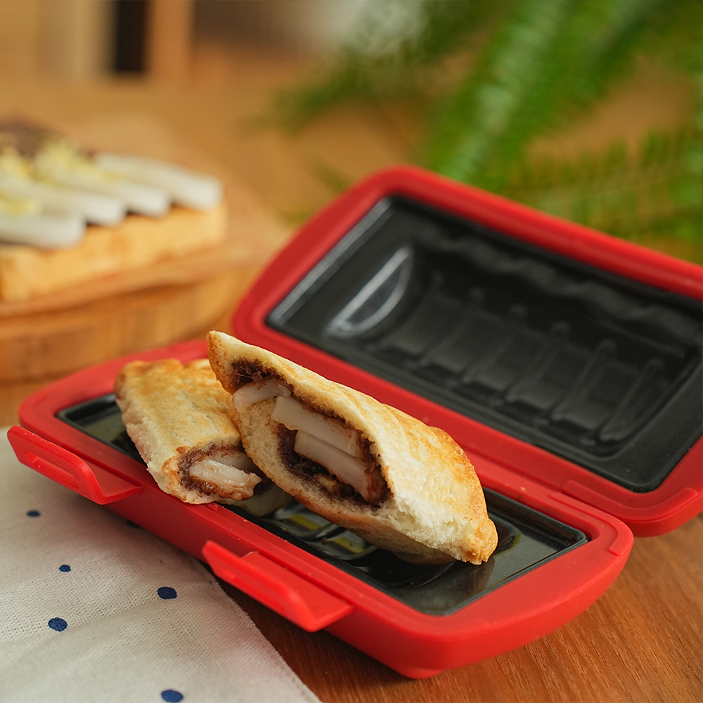 - 蓋上第二片吐司,扣緊熱壓器的矽膠鎖扣。