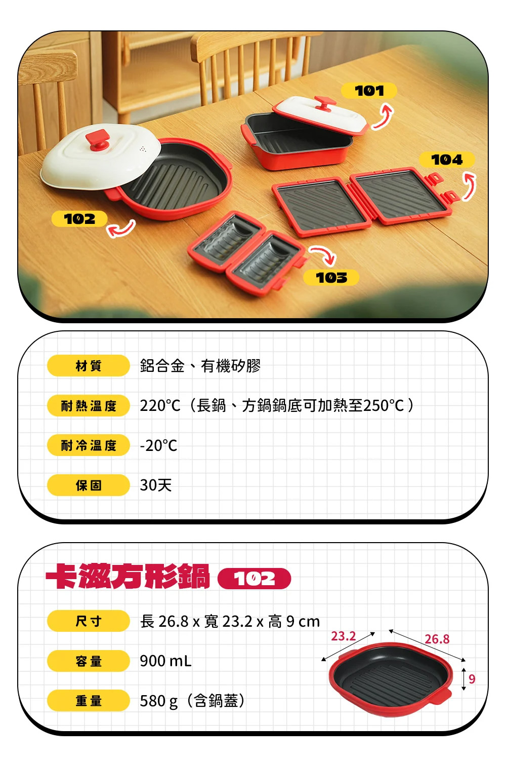 耐熱温度:220℃(長鍋、方鍋鍋底可加熱至250℃)